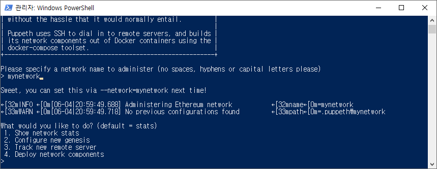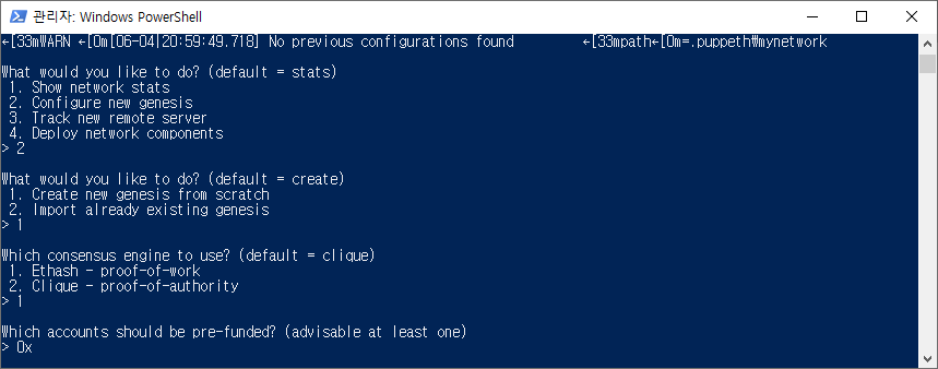 제네시스 구성 선택, 합의 알고리즘 선택 (pow or poa), 어떤 계정이 미리 eth 를 받아야하나 패스, 네트워크 아이디 정하기