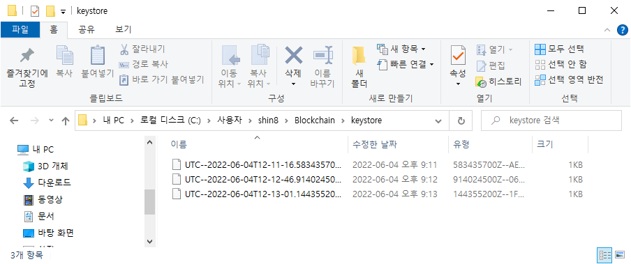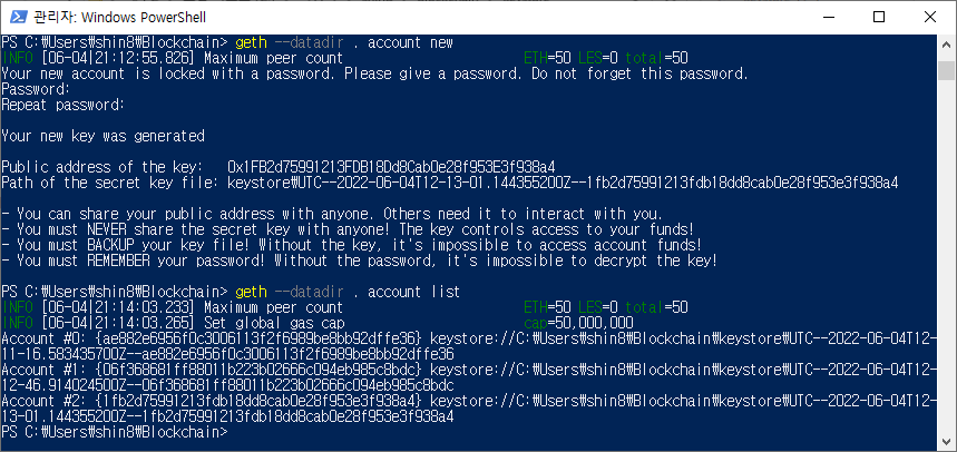 - 앞으로 만드는 새로운 계정들은 keystore에 저장된다.