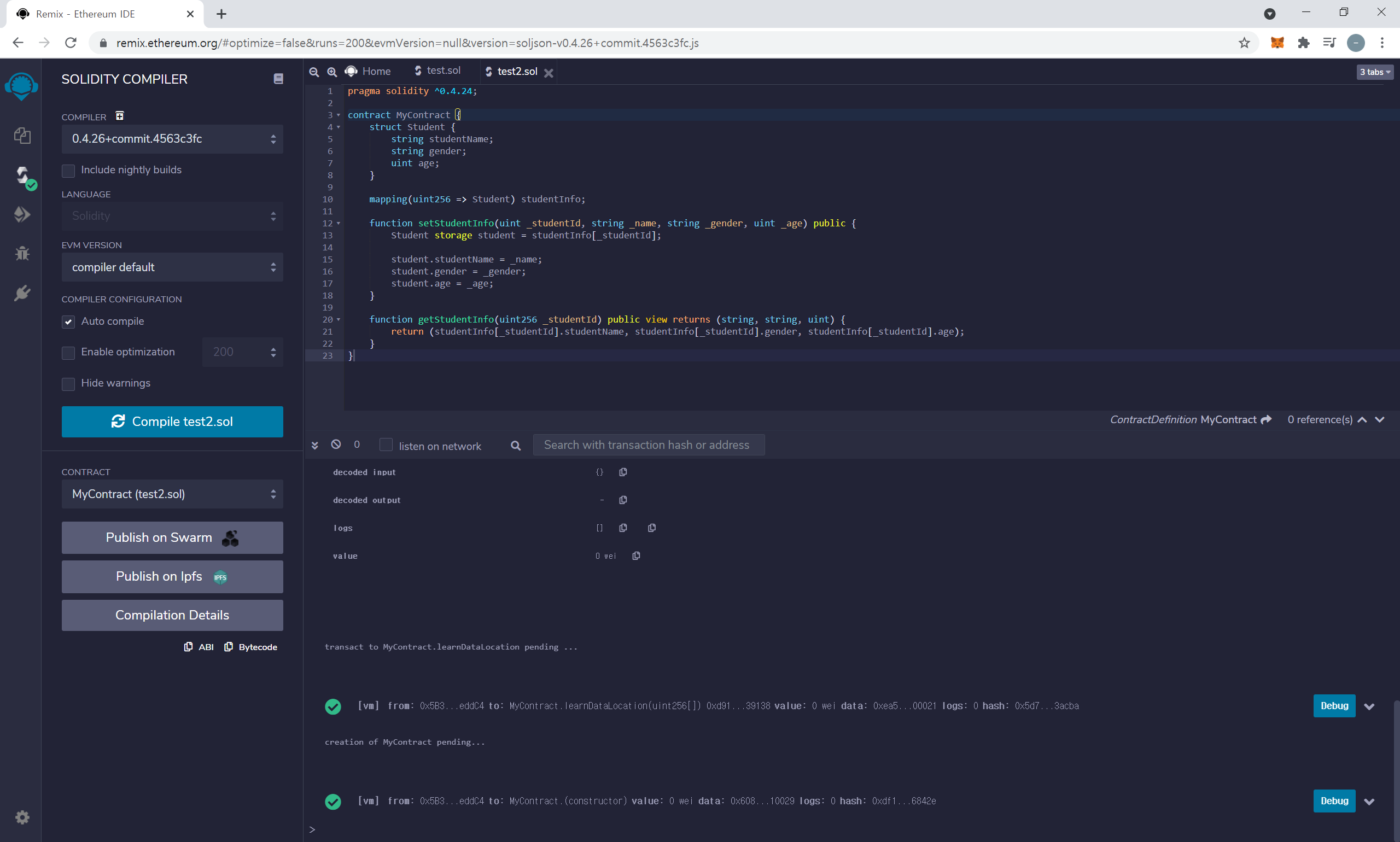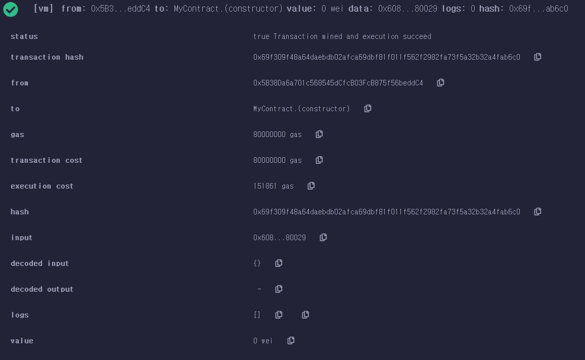배포된 컨트랙트의 디버깅 버튼 클릭