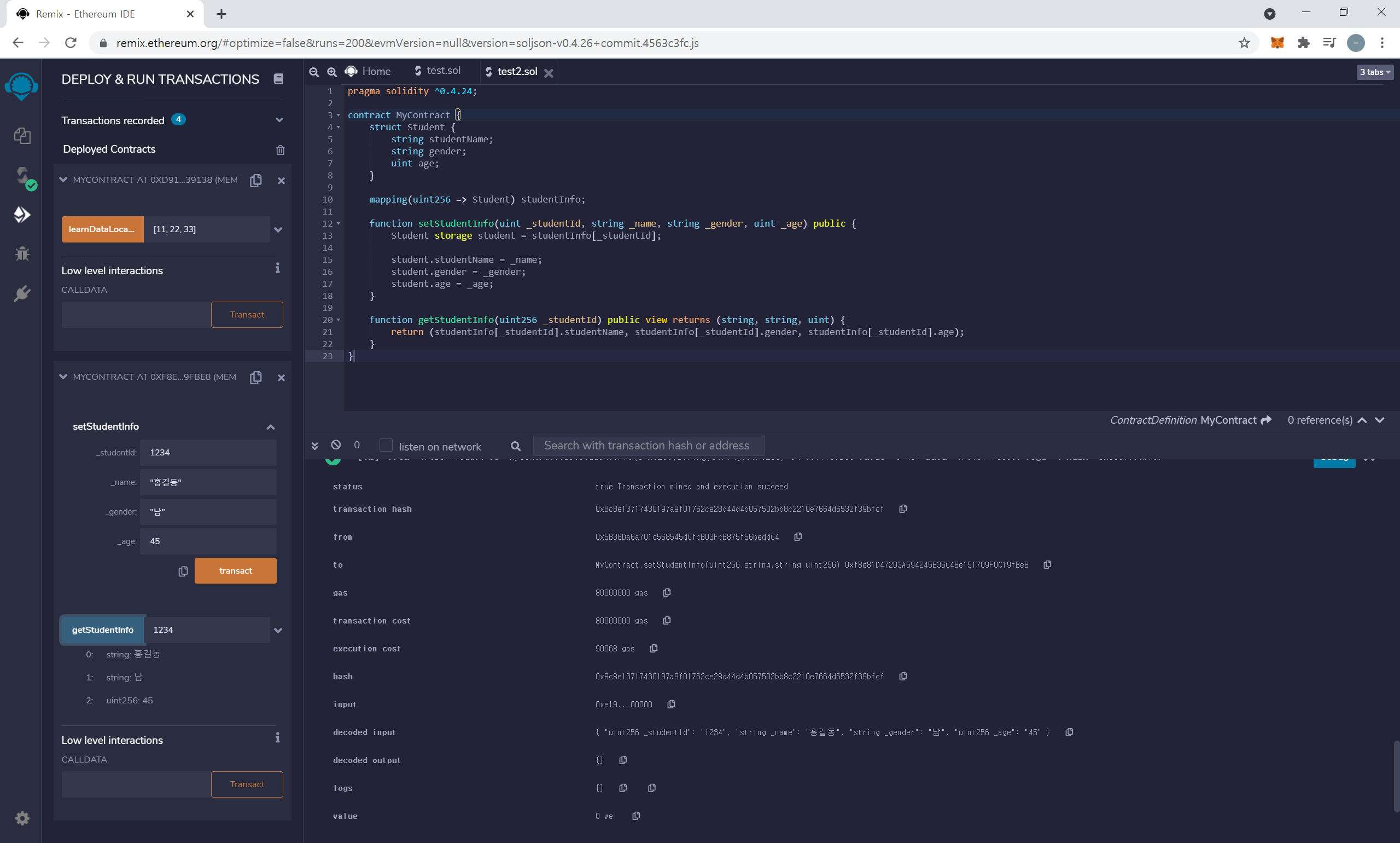 setStudentInfo 매개변수에 값 입력하기 (_studentid : 1234, _name: "홍길동", _gender: "남", _age: 45)