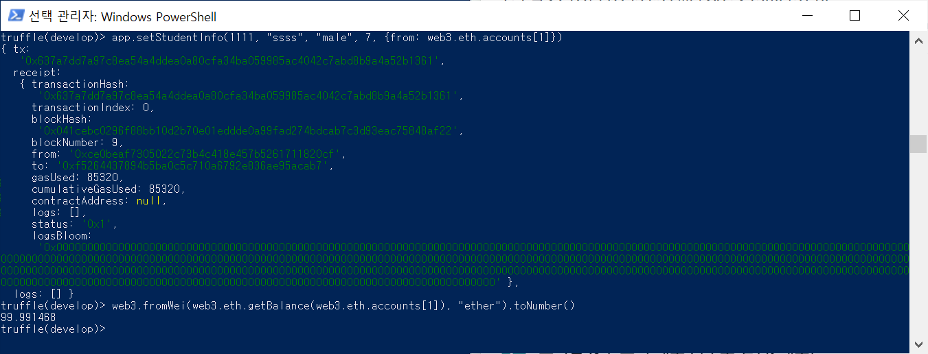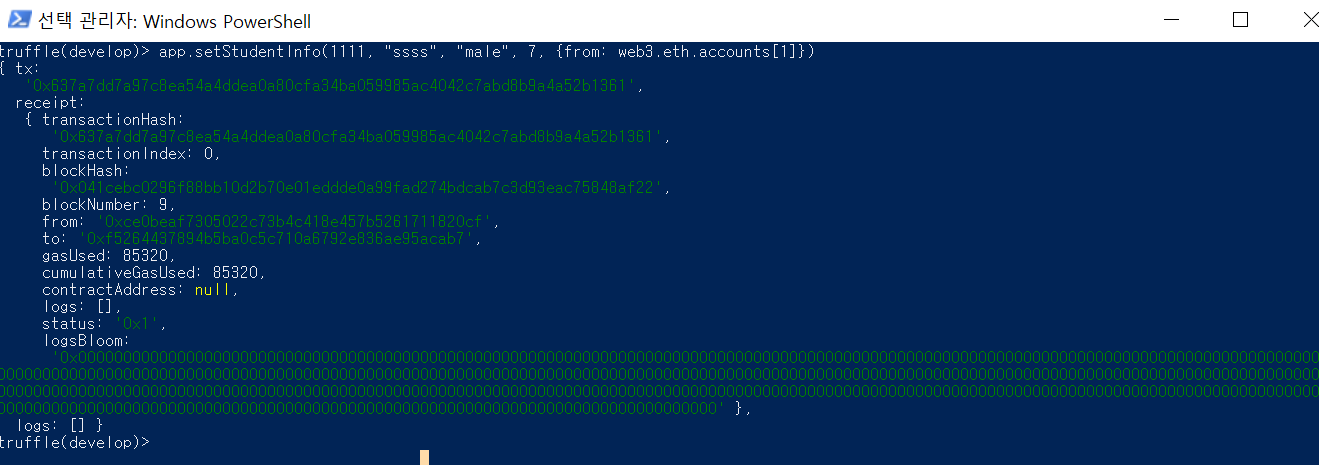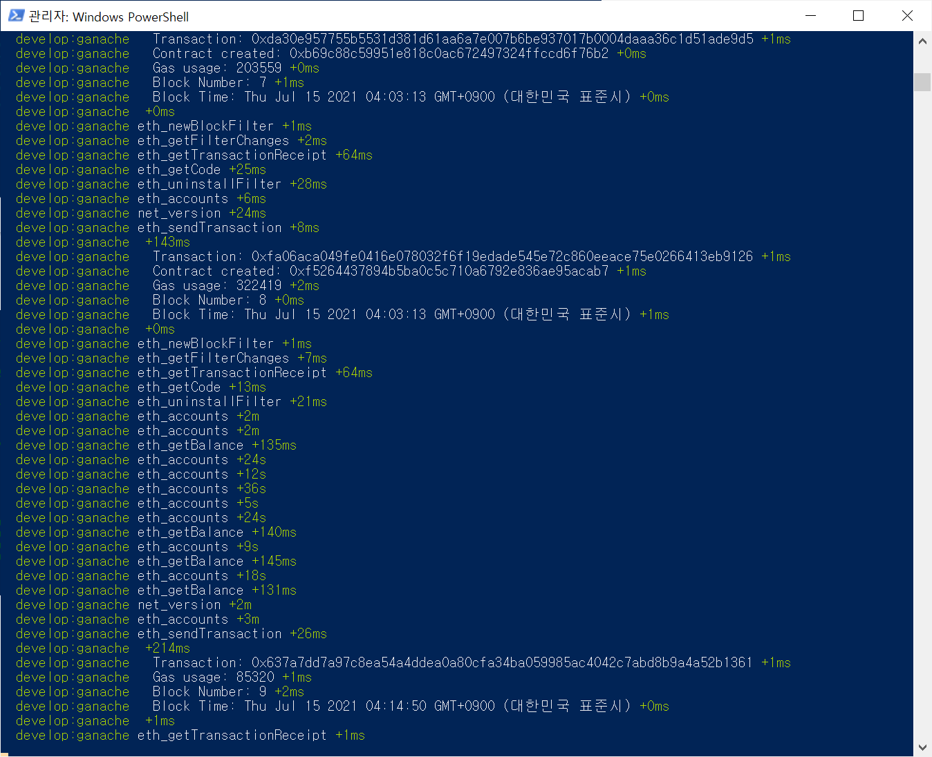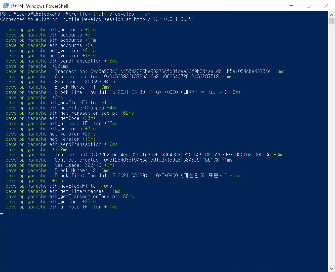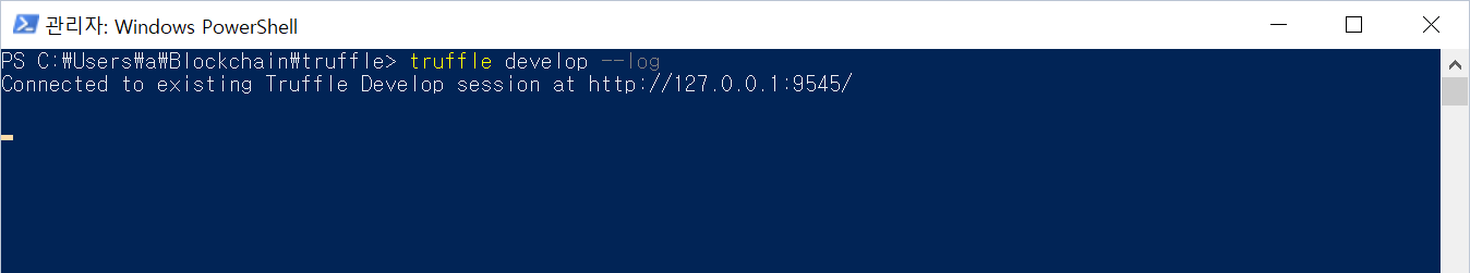 파워쉘 하나를 더 띄워서 truffle develop --log 실행