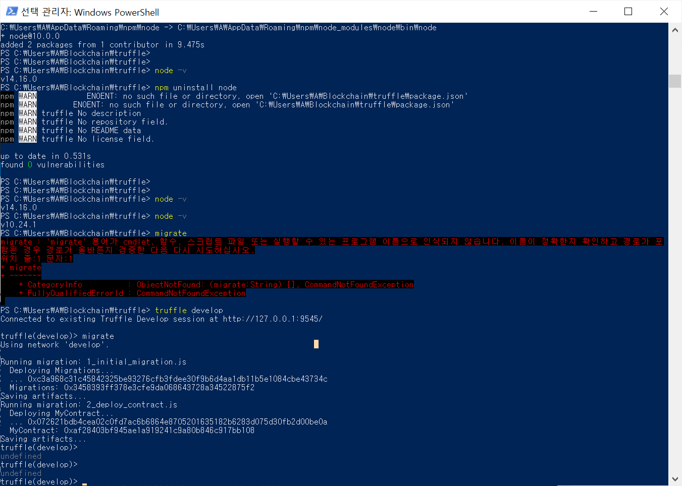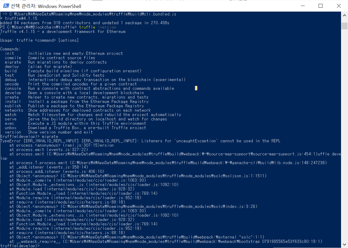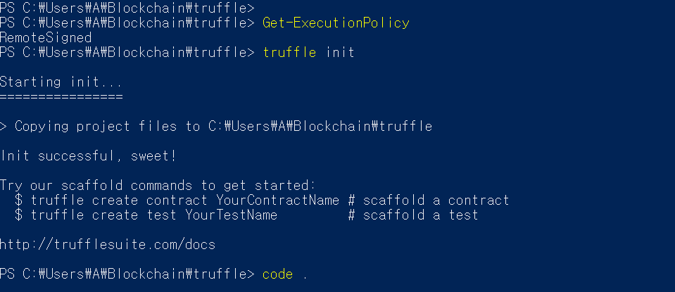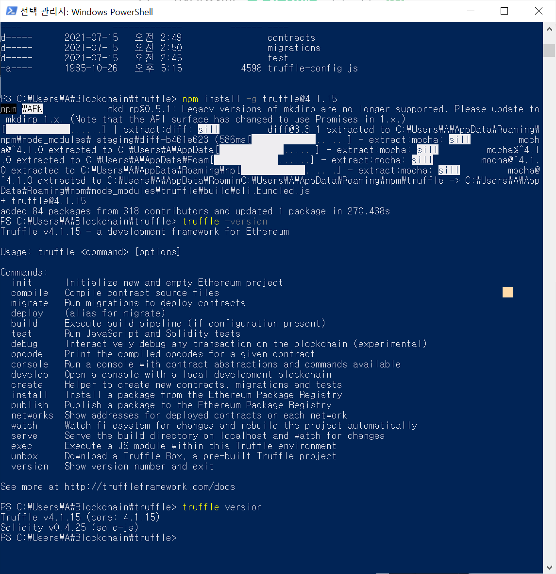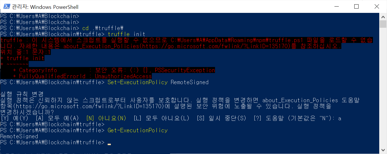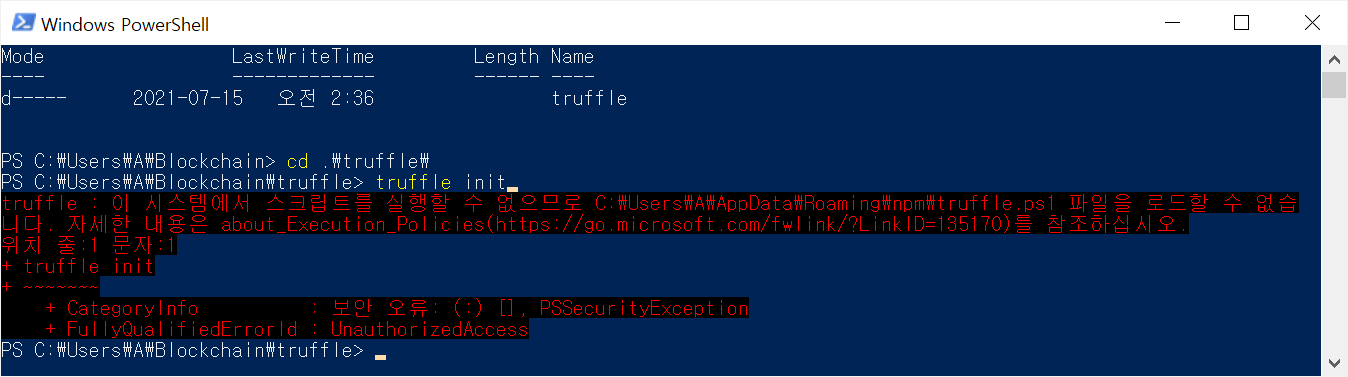 - truffle init 명령어 실행시 오류 발생 (파워쉘 관리자 권한 실행)