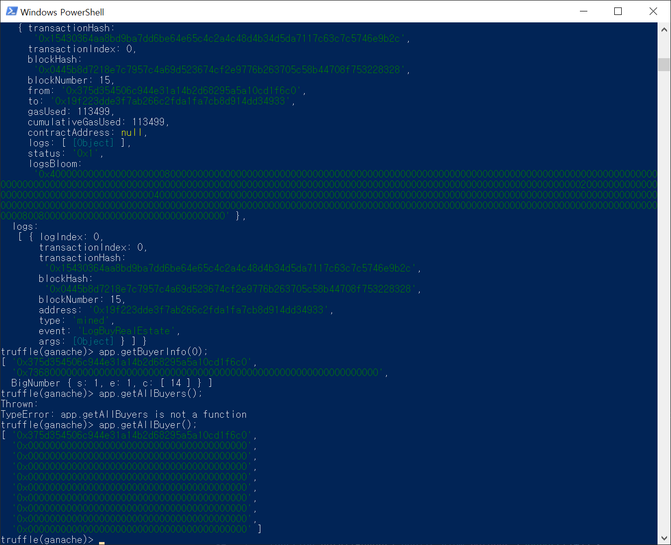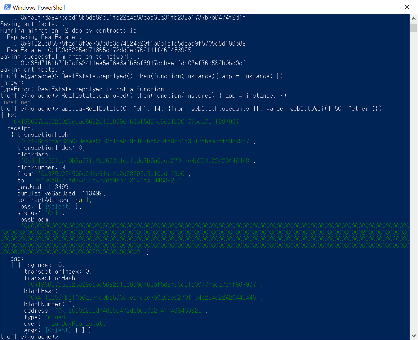 트러플 콘솔을 열고 app의 buyRealEstate()함수를 실행해보자.