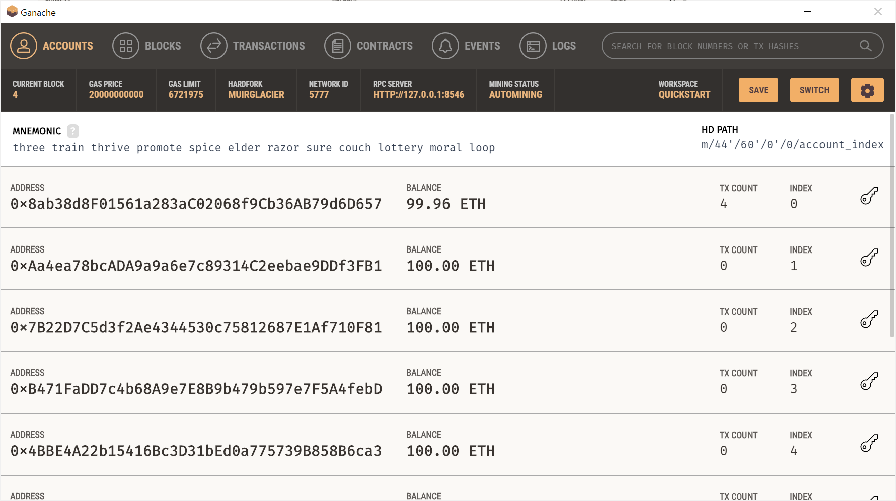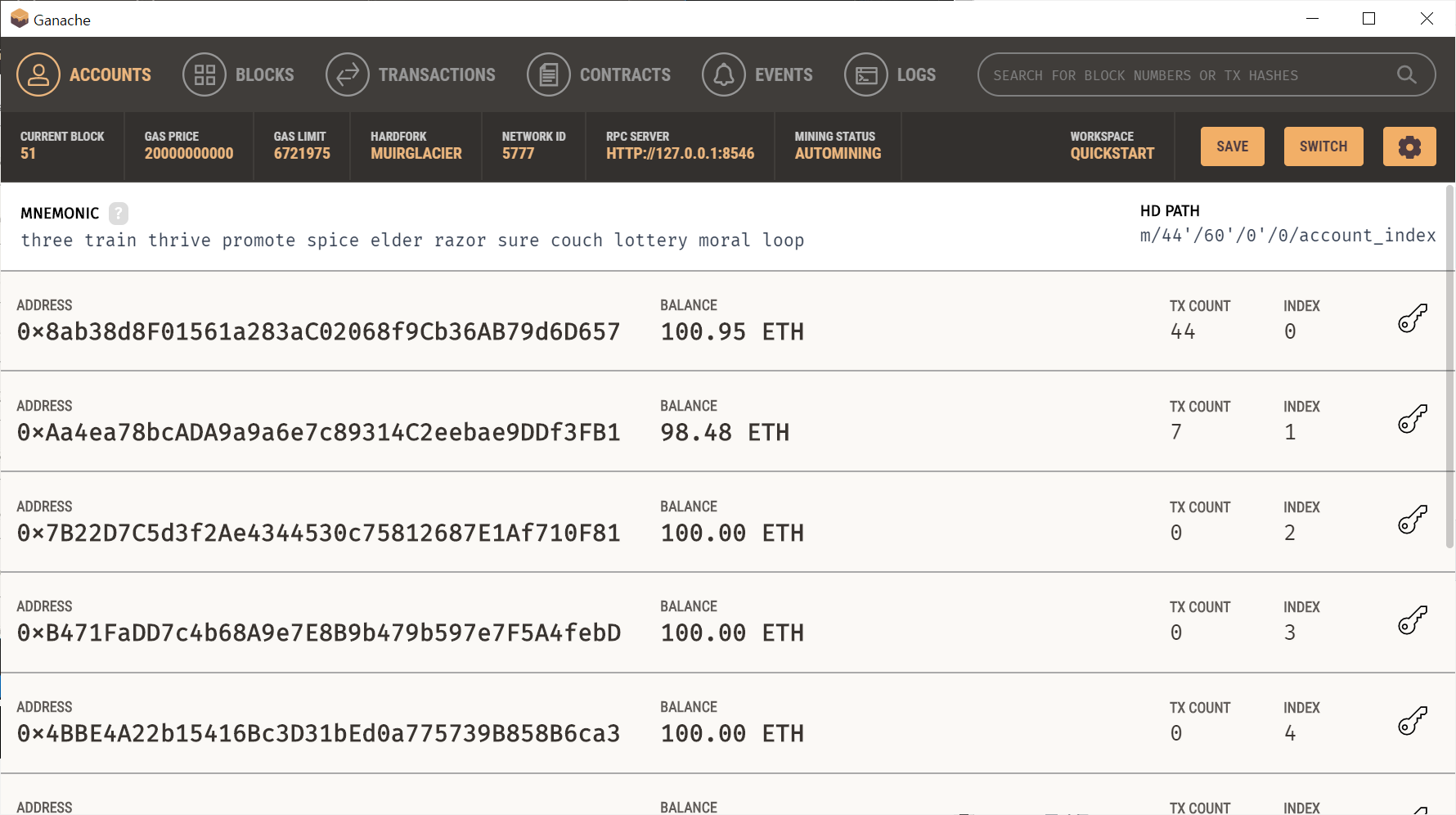 가나쉬의 첫번째 계정이 배포하는데 사용됨 (BALANCE가 줄어든것을 확인)