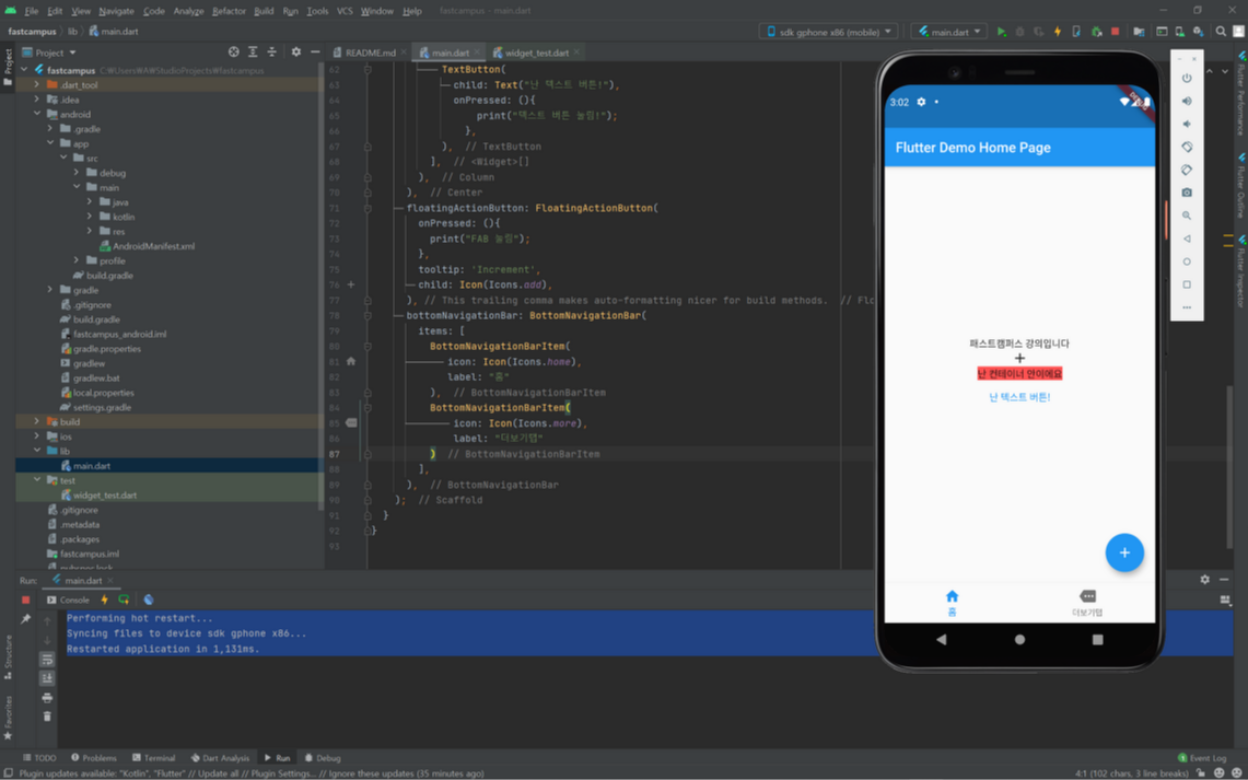 오늘은 플로터 앱에 실제적인 view 를 작성할수 있는 방법에 대해 학습하였다. 기본적인 디자인 요소인 위젯과 위젯을 구성하고 있는 MaterialApp클래스, Scaffold 클래스 그리고 Text를 표시할수 있는 Text 위젯, 아이콘을 보여줄수 있는 Icon 위젯, 그림들을 표시할수 있는 Image 위젯 등 이러한 디자인 요소들로 실제 앱을 디자인하고, 표시할수 있다. 또한 iOS 앱에서 흔히 볼수 있는 Cupertino, 그리고 UI 구성 요소들인 AppBar와 FloatingActionButton, BottomNavigationBar, BottomSheet 이러한 요소들로 훨씬더 동적으로 움직일수 있는 앱을 만들수 있을거라는 생각이 들었다. 그리고 간단히 BottomNavigationBar를 통하여 탭을 만들어서 앱 하단에 표시될 수 있도록 구현하고, 탭 클릭시 마다 그 상태를 표시할수 있는 setState() 함수를 사용하여 화면 상태를 알려주는 index를 추가 하였다. 실제 앱의 화면을 구성하거나 표시할수 있어서 신기했지만, 아직은 전체적인 소스구조와 함수명등이 익숙하지 않아서 어려운것 같다. 이것저것 건들면서 오류도 나고, 해석도 해보면서 점점 Dart 언어 구조에 대해서 익숙해져야겠다.