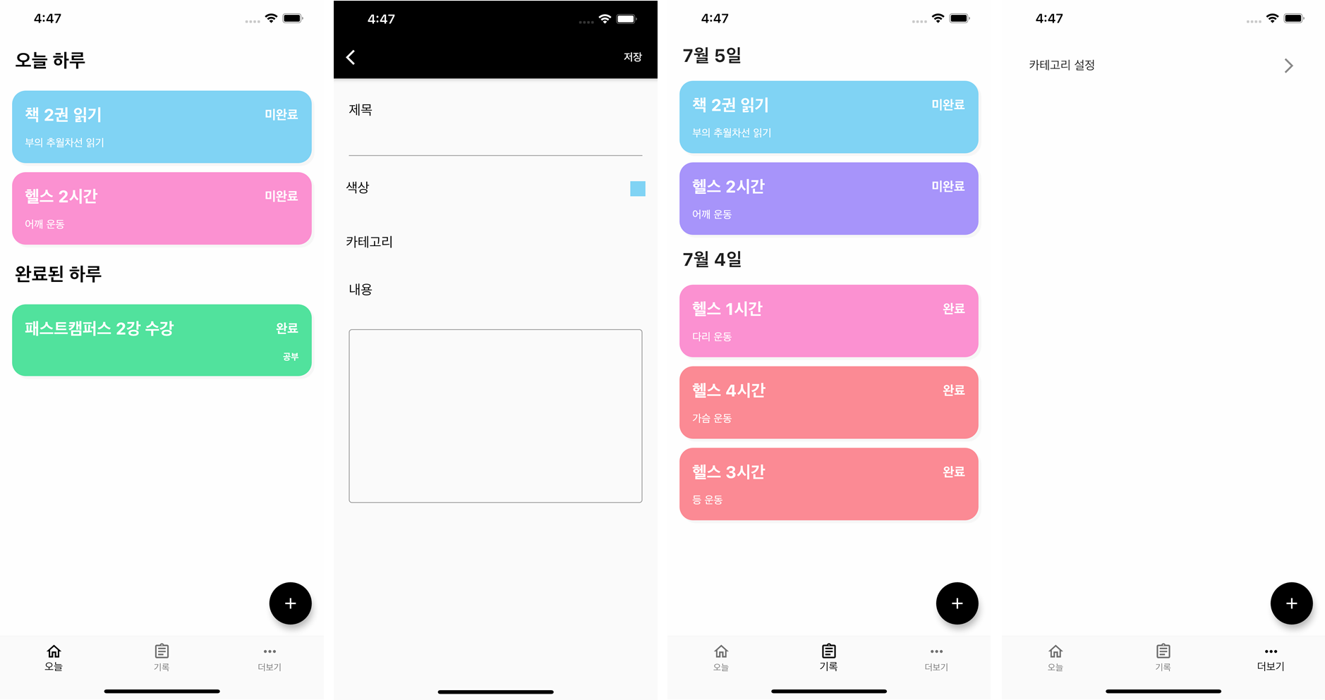 - TODO 기록 화면 만들기 (이전 할일 기록 리스트, 카테고리 별 리스트)