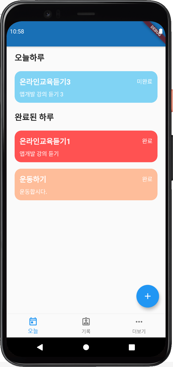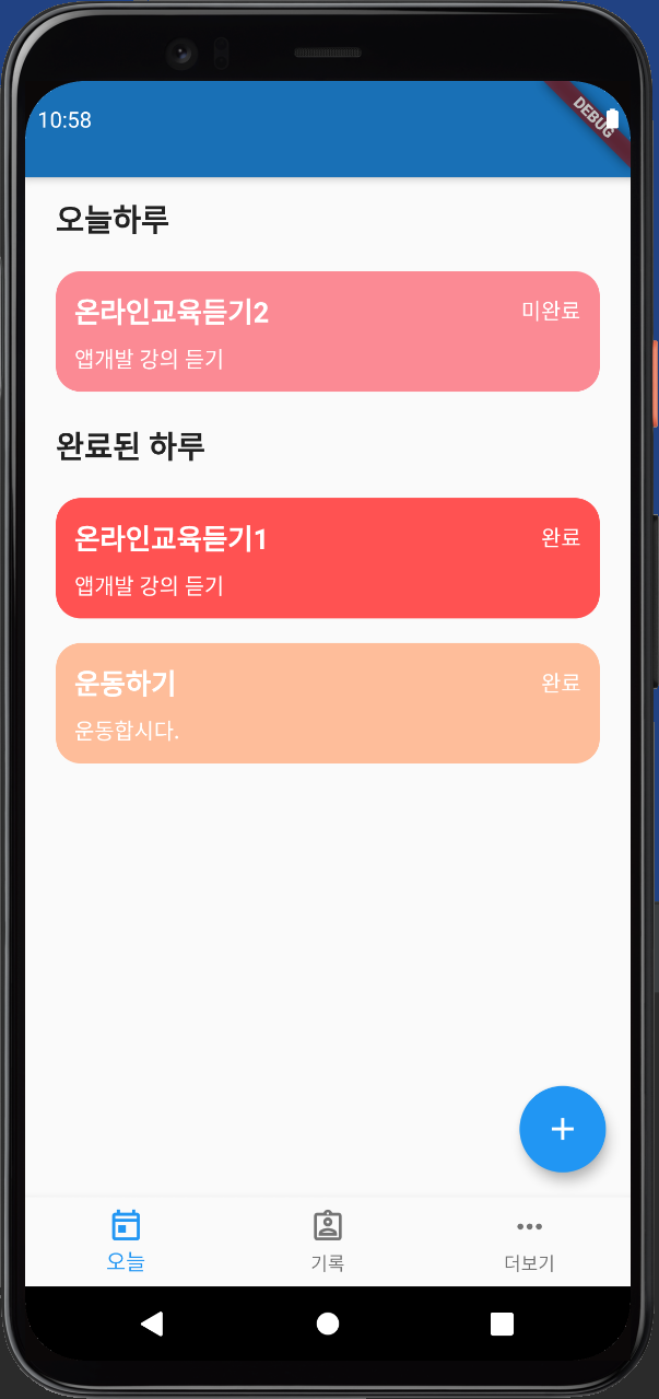 오늘은 tolist 추가 페이지에서 기록하고 이전페이지 기록까지 확인하는 페이지를 만들었다. 수정하거나 완료/미완료로 변경하거나 하는 기능도 추가했는데, main.dart 에서 카드를 클릭 가능하도록 linkwell 을 사용하였다. t.done을 통해서 0일때 미완료일때는 완료로 변경하고, t.done이 1일때 완료일때는 미완료로 변경하도록 하였다. 이때는 실제 state 가 변경될수 있도록 setSate 함수로 감싸줘야 한다. 또한 stateless widget 을 사용하여 card 그리는 위젯을 작성하였다. 왜냐하면 상태를 변경하는건 페이지가 stateful 을 사용하면 되고, 카드들은 todo 정보들만 변경하면 되기 때문이다. card 를 렌더링 하기 위해선 기존에 만들어놓은 컨테이너를 사용하였다. 다만 클래스에 t라는 변수가 없기 때문에 final Todo t라는 변수를 사용하여, todo card widget을 생성할 때 매개변수로 받아 처리하도록 하였다. todo card를 추가하면, 위에 생성한 컨테이너를 생략 가능하게 하여 코드를 간결하게 만들어준다. write.dart 에서 값을 받을수 있게 하기 위해서 initstate 페이지가 생성될 때 처음 해야하는 일들을 정의 해줬다. 제목을 위한 name controller와 memo controller를 통해 새로운 값으로 덮어씌우는 구조를 만들수 있었다.