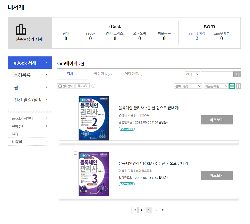 블록체인 관리사 2급, 3급 자격증 책이 있어서, 사볼려고 했는데 금액이 워낙 비싸서, 교보문고 디지털ebook 확인해보니 있어서, sam 1개월 이벤트 가입하여 공부하였음 ^^