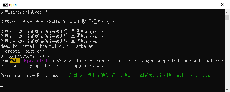 cmd 터미널을 열고, 리액트 프로젝트를 만들 폴더에서 npx 를 이용해 새로운 리액트 프로젝트를 생성한다.