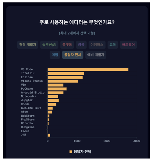 - Visual Studio Code는 마이크로소프트에서 만든 오픈 소스 코드 편집기이다. 미려한 디자인과 강력한 성능을 모두 갖추고 있어서 많이 사용하고 있다. 2021년 프로그래머스 설문조사에서도 선호도 1위를 차지했다.