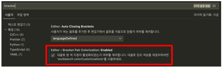 - Bracket Pair Colorization : 코드의 괄호끼리 색상을 맞추어주는 설정이다.