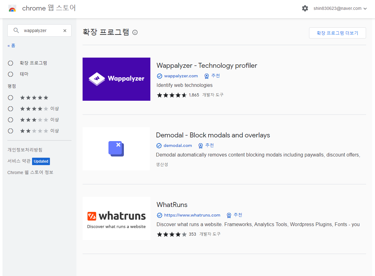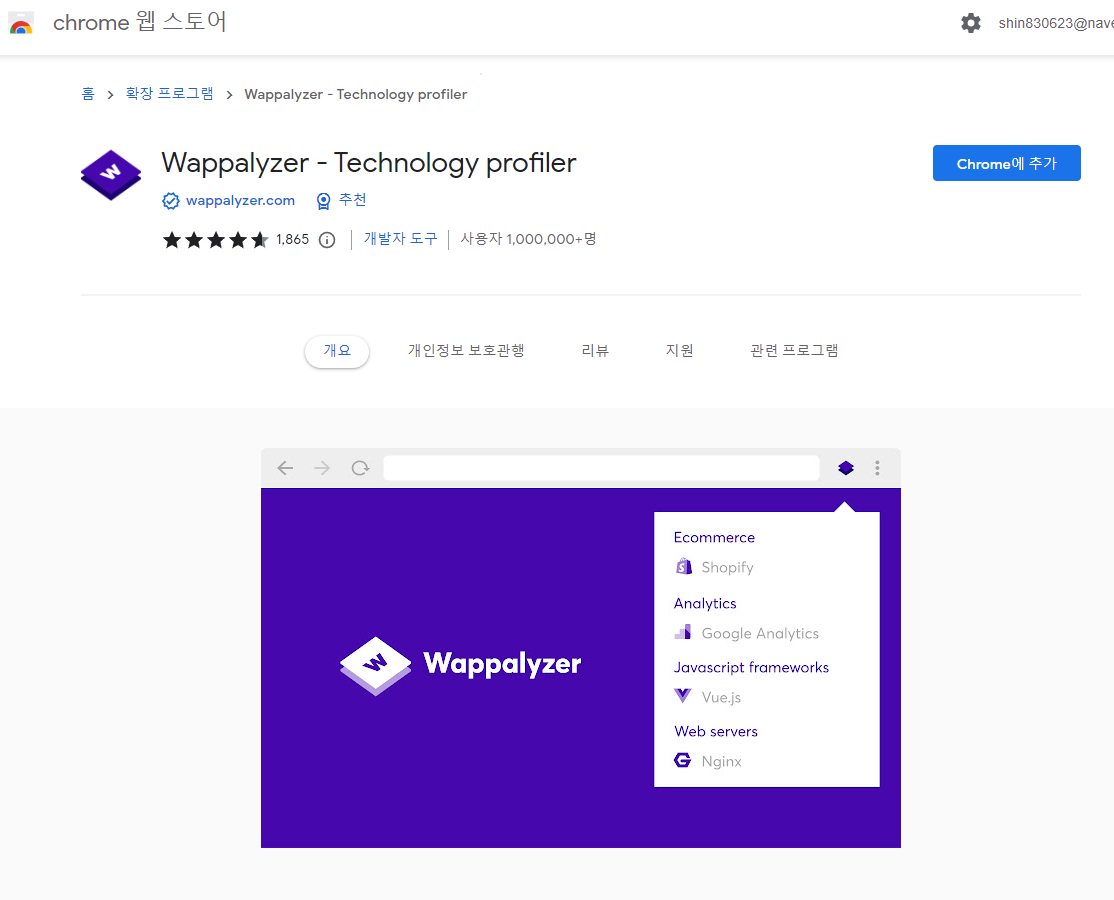 # chrome 웹스토어에서 wappalyzer 검색 후 설치