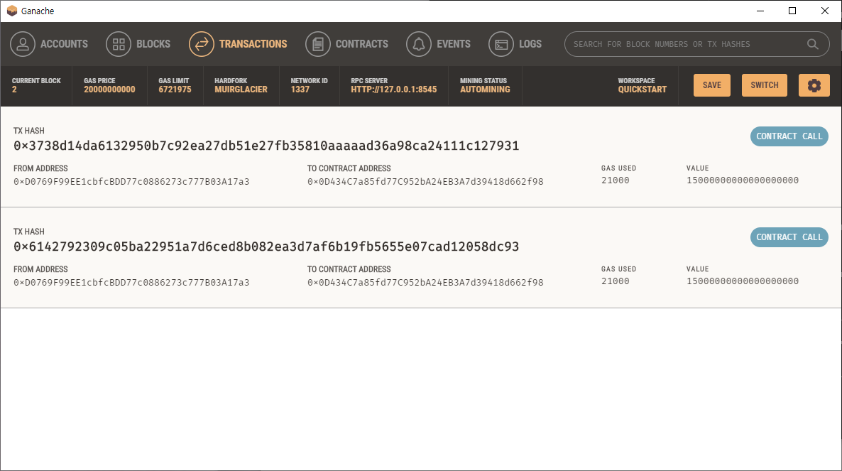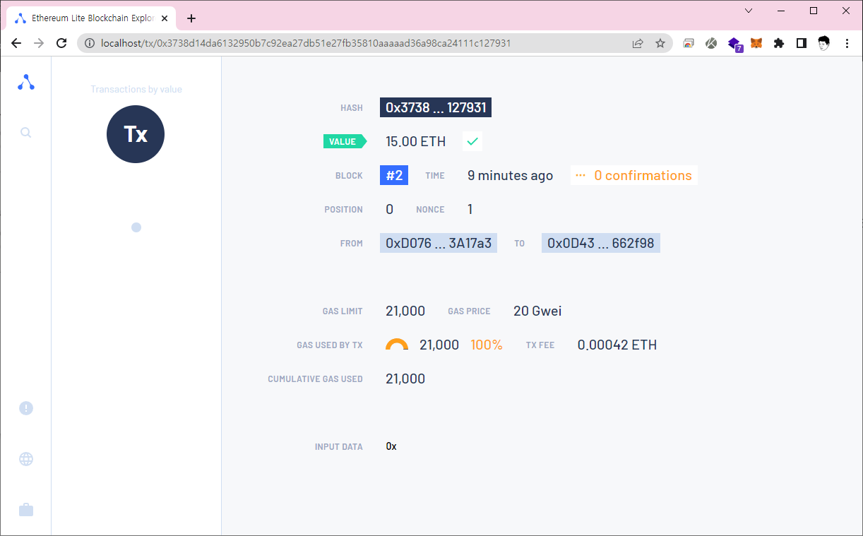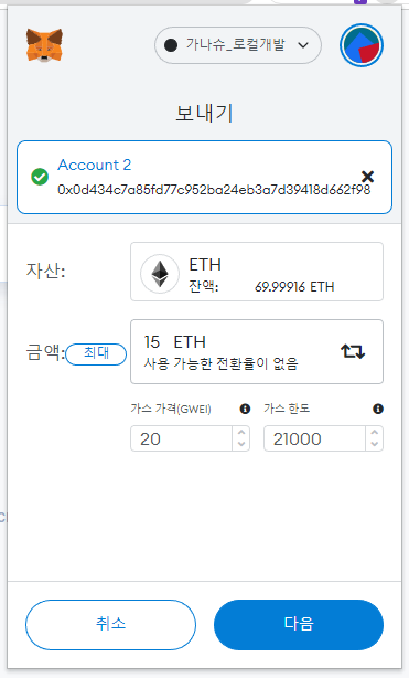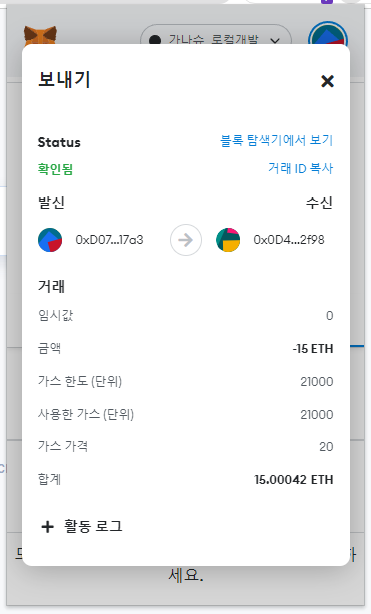 가나슈를 실행시키고, 메타마스크 지갑에서 트랜잭션을 발생시켜보자. (샘플 : 두번째 계좌로 15eth 송금)