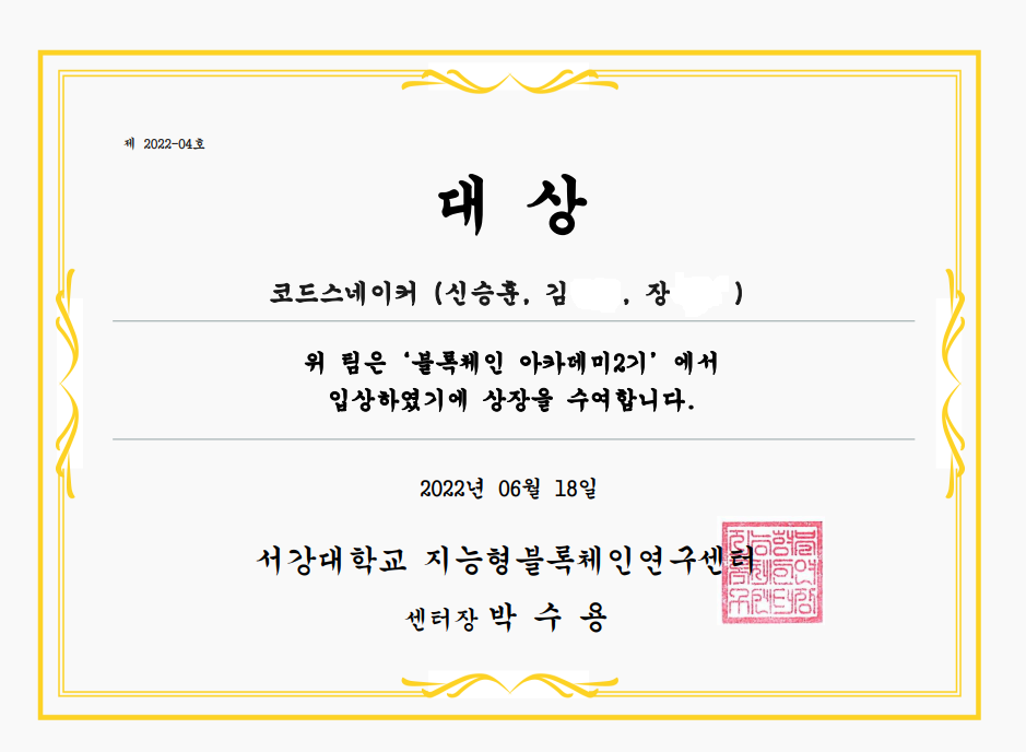서강대학교 블록체인 교육 과정을 들으면서 진행한 프로젝트에서 1등하여 대상을 차지 하였다.