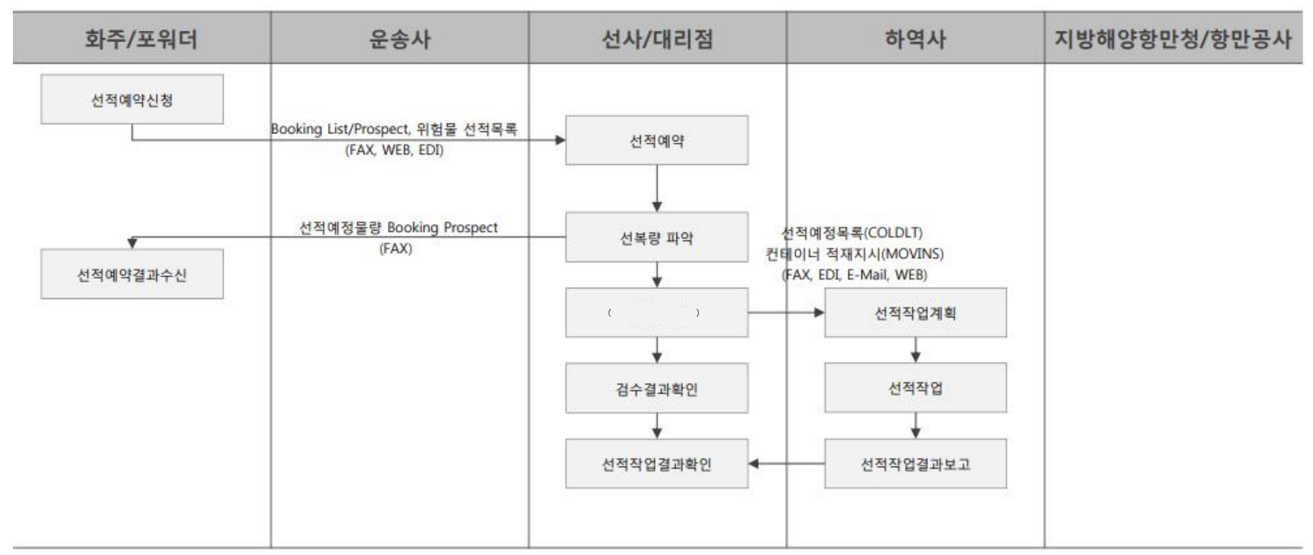 나. 운송계약체결 → 적화예약목록송부 → 적부도 등의 인도→ 수출통관 → 선적지시서 교부 → 물품 인도 → 선적및 검수 → 본선수취증 발급 → 선하증권 발급 → 용적·중량 증명서 발행 의뢰 → 적화목록 송부
