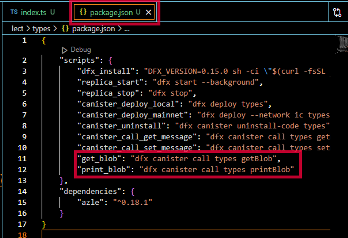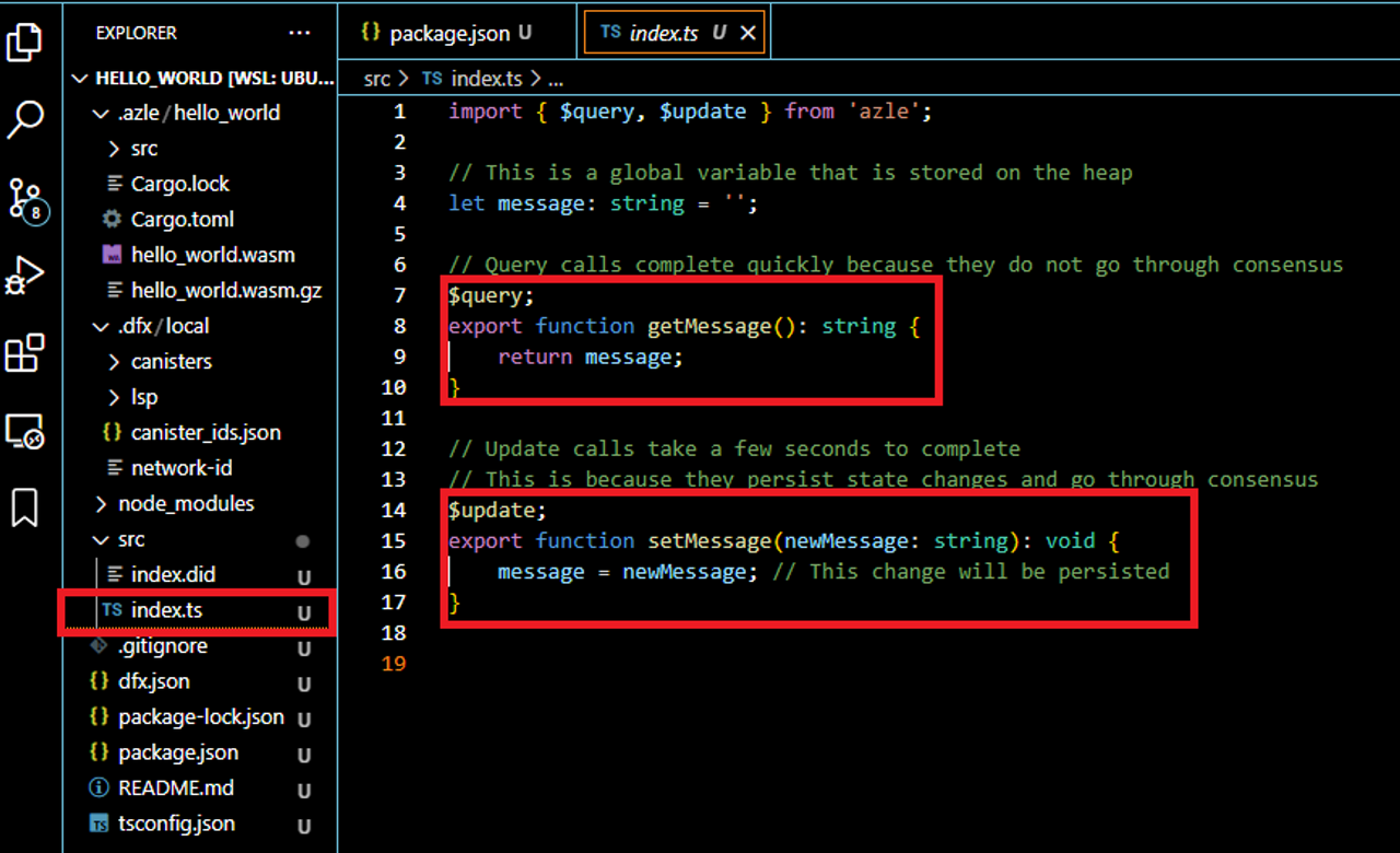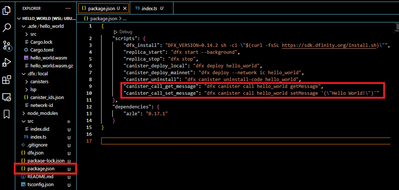 메세지 변경 : package.json 파일에 set_message의 인자를 변경(”Hello Azle!!!)