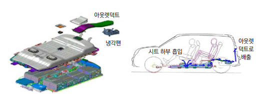 배터리 팩의 온도는 통상 30˚C 이하로 유지된다. 이를 위해서 온도가 높을 경우 냉각팬을 구동해 냉각을 시키게 되는데, 아래 좌측 그림에서 냉각팬은 차량 후면에 위치해 있으며 냉각 통로는 앞자리 시트 하부를 통해서 배터리를 거쳐 아웃렛 덕트로 배출되는 구조로 되어있다. 냉각팬은 총 9단으로 제어되며 BMS 에 의해 배터리 온도에 따른 속도 제어를 실시한다.