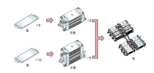 | 2 | 모듈(Module) | · 배터리 셀(Cell)을 외부충격과 열, 진동 등으로부터 보호하기 위해 일정한 개수로 묶어 프레임에 넣은 배터리 조립체 |
