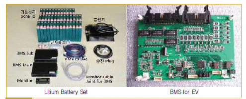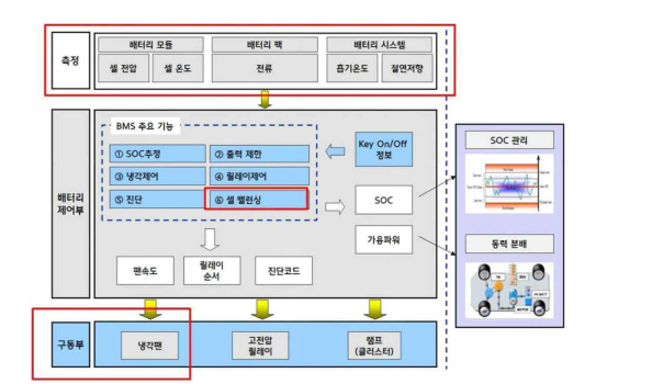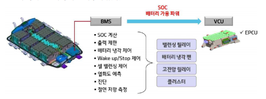 》 배터리 관리 시스템은 고전압 배터리 전기자동차의 주행 및 각종 제어에 있어서 가장 중요한 동력원이기 때문에 배터리의 에너지 상태를 파아하고 이에 따른 적절한 에너지 분배를 하기 위한 별도의 제어 시스템이 필요하다. 이 때 차량에서 사용하는 고전압에 대한 가용 파워를 차량 통합제어기와 인버터로 전송하고 현재 배터리의 상태를 충전 상태(SOC, State Of Charge)로 계한하여 알려주는 기능을 한다. 또한 고전압 배터리의 각 셀당 전압편차를 보정하기 위한 셀 밸런싱 기능과 배터리 온도에 따라 냉각팬을 구동하는 기능이 있다.