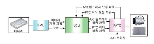 전자동 온도 조절 장치(FATC; Full Automatic Temperature Control)는 운전자의 냉·난방 파워를 차량 컨트롤 유닛(VCU; Vehicle Control Unit)에게 요청하며, 전자동 온도 조절 장치(FATC)는 차량 컨트롤 유닛(VCU)가 허용하는 범위 내에 전력으로 에어컨 컴프레서와 피티씨(PTC; Positive Temperature Coefficient Heater) 히터를 제어한다.