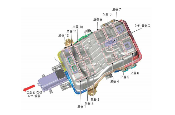 》배터리는 전기자동차의 동력원인 전기에너지를 공급하기 위해서 많은 양의 배터리가 필요하며, 많은 양의 전기에너지를 보관하기 위해서는 대용량배터리가 필요하다. 탑재되는 배터리는 리튬이온성분으로 배터리를 개발하고 있다. 전기 자동차의 고전압 배터리는 아래와 같이 구성되어 있다.