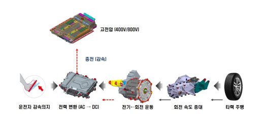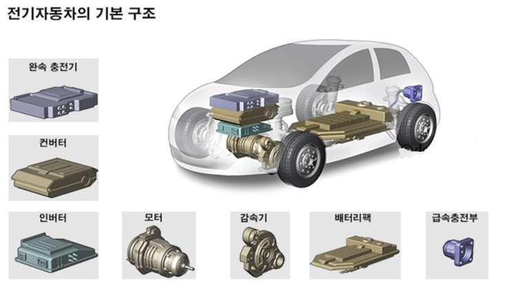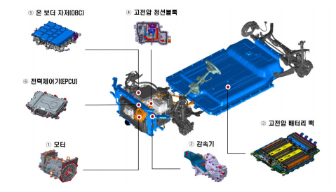 》전기자동차는 외부 공급원 및 모터로부터 충전된 전기에너지를 이용하여 주행하는 전력 기반의 자동차로서 차량 하부에 장착된 약 300~400V의 고전압 배터리팩이 전원으로 전기에너지를 저장하고 모터로 공급하여 동력이 발생되는 자동차이며 주요 핵심부품으로는 충전기, 컨버터, 인버터, 모터, 감속기, 배터리팩 및 급속충전부로 구성되어 있다.