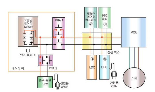》 전기자동차는 고전압 배터리, 파워 릴레이 어셈블리 1·2(PRA; Power Relay Assembly 1·2, 전동 식 에어컨 컴프레서, 저전압 직류 변환 장치(LDC, Low DC-DC Converter), PTC 히터(Positive Temperature Coefficient heater), 차량 탑재형 배터리 완속 충전기(OBC; On-Borad battery Charger), 모터 제어기(MCU; Motor Control Unit) 구동 모터가 고전압으로 연결되어 있으며, 배터리 팩에 고전압 배터리와 파워 릴레이 어셈블리 1·2 및 고전압을 차단할 수 있는 안전 플러그가 장착되어 있다. 파워 릴레이 어셈블리 1은 구동용 전원을 차단 또는 연결하는 릴레이며, 파워 릴레이 어셈블리 2는 급속 충전 시 배터리 관리 시스템(BMU, Battery Management Unit)의 신호를 받아 고전압 배터리에 충전될 수 있도록 전원을 연결하는 기능을 한다.