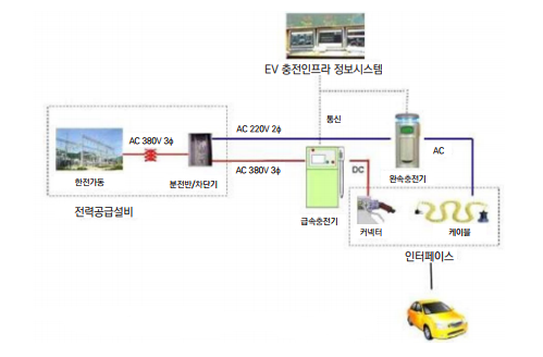 》 전기자동차 충전 인프라(EVCI, Electric Vehicle Charging Infrastructure)는 충전과 관련된 하드웨어(H/W)기반의 충전기 제조와 소프트웨어(S/W)기반의 플랫폼 운영, 그리고 서비스 차원 충전 인프라 운영 등을 총칭하며, 크게 전기자동차를 운행하기 위한 전력공급설비, 충전기, 인터페이스, 정보시스템 등으로 구성되어 있다.