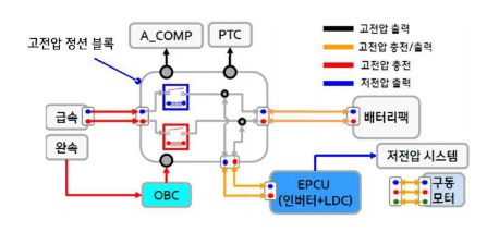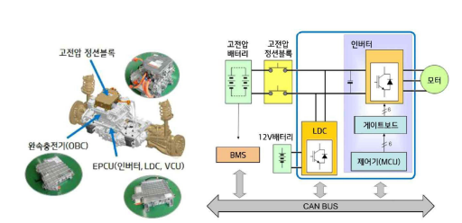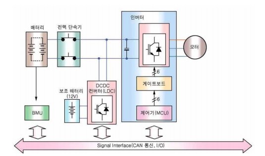 대전력량의 전력 변환 시스템으로서 고전압의 직류를 전기자동차의 통합제어기인 차량 제어 유닛(VCU; Vehicle Control Unit) 및 구동 모터에 적합한 교류로 변환하는 장치인 인버터(Inverter), 고전압 배터리 전압을 저전압의 12V DC로 변환시키는 장치인 LDC 및 외부의 교류전원을 고전압의 직류로 변환해주는 완속 충전기인 OBC 등으로 구성되어 있다.