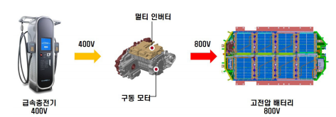 구동 모터의 회전 속도와 토크를 제어와 전력 변환의 모터 컨트롤 유닛의 역할을 하며 외부 400V 급속 충전기로 800V 고전압 배터리 충전을 위한 승압을 한다. 그로 인해 멀티 인버터와 구동 모터를 사용하여 충전 시간을 단축 시킨다.