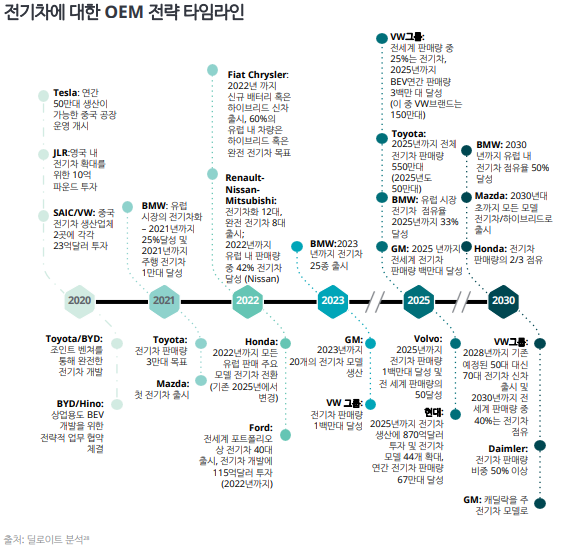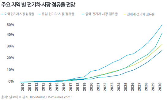 》전기자동차는 디로이트에서 발간한 '전기차 시장 전망'에 따르면 향후 10년간 글로벌 전기자동차 시장 연평균 성장률은 29%에 달할 것으로예상하며 전기자동차 판매량은 2020년 250만대, 2025년 1120만대, 2030년 3110만대 등으로 증가할 전망이다. 지난 신종 코로나바이러스 펜데믹이 시장에 미친 영향에도 불구하고 전기자동차 시장은 장기적으로 견고한 성장세를 보였으며 시장 성장에 영향을 미친 요인 4가지로 소비자 인식의 변화, 정책 및 규제, 주문자상표부착생산(OEM;Original Equipment Manufacturing)의 전략, 기업의 역할(기업의 자동차구매) 로 전기차 구매를 예상했다.