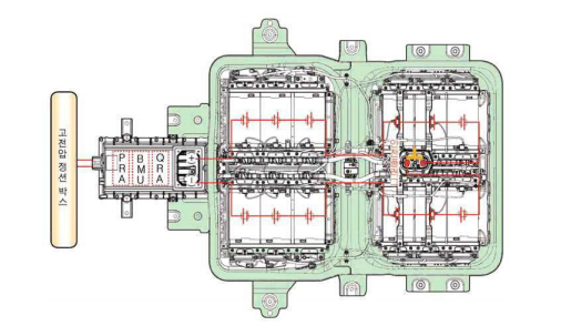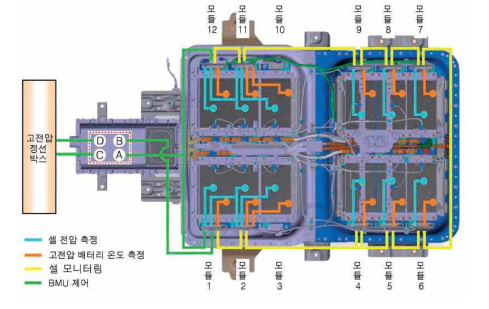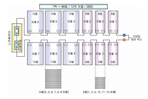 배터리 관리 시스템, 모듈의 온도를 관리하는 셀 밸런싱, 배터리 모듈, 배터리에서 모터 전력 공급 시 전력을 제어 하는 장치(릴레이, 퓨즈, 저항, 각종 센서 등으로 구성), 세이프티 플러그와 냉각수 입출구, 저전압 신호, 승온히터 전원, 고전압 전원 등으로 구성되어 있다.