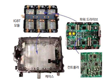 》 여기서 인버터는 전기차의 구동 모터로 공급되는 고전압을 직류에서 교류로 변환하고 또한 회생제동 시에는 모터에서 발생 되는 교류 전압을 직류로 변환하는 역할을 한다. 전기차 구동용으로 사용되는 모터는 교류 모터이므로 3상(X, Y, Z)교류로 제어해야 하며 이 역할을 인버터가 하고, 모터의 회전 속도와 토크, 회생제동 등에 필요한 제어는 모터 제어기(MCU)가 담당한다. 모터를 구동시키는 방법은 인버터 내부의 전력용 반도체를 사용하여 특정한 주파수와 전압을 가진 교류로 변환시켜 회전 속도를 제어하는 것이다. (자속 밀도를 일정하게 유지하기 위해 전압과 주파수를 동시에 변화시킴)